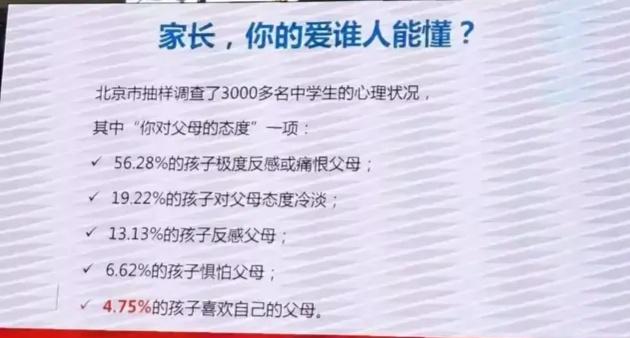 北京市一家机构抽样调查了3000名孩子的心理状况,没想到其中一项的调查结果令人(可以说是令父母)心惊胆战,那一条是问孩子对待父母态度,数据显示是56.28%的孩子对父母极度反感和痛恨。