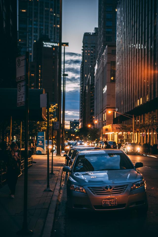 暮色四合时的街景,冷暖色调交织的美。