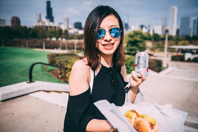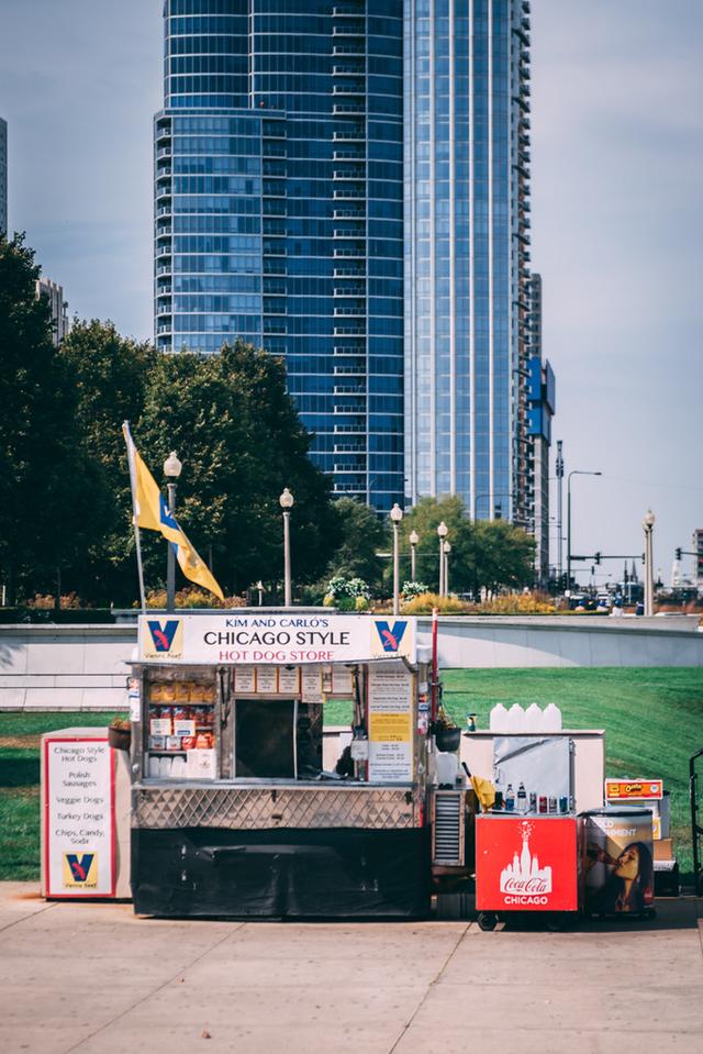 午餐在水族馆旁的餐车吃Chicago Style Hotdog。和纽约热狗需要大量淋上番茄酱和蛋黄酱不同,芝加哥特色热狗以腌黄瓜和酸辣椒提味,吃起来酸爽清新不腻口,别有风味。