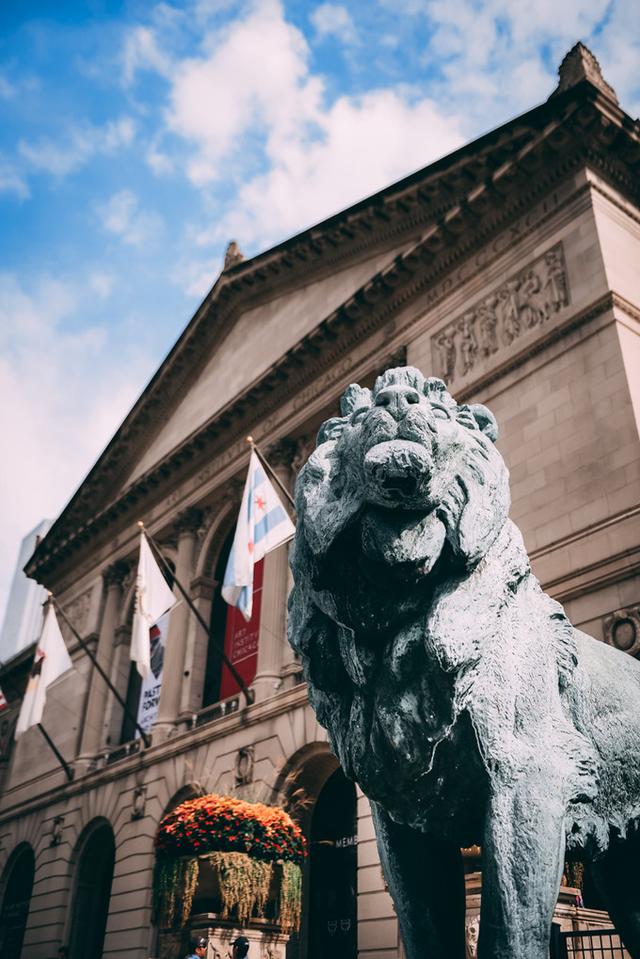 芝加哥艺术馆门口威武的大狮子。节日庆典或城中球队夺冠时,人们会为大狮子穿起特制的应景衣裳,戴上花冠,自成一道风景。