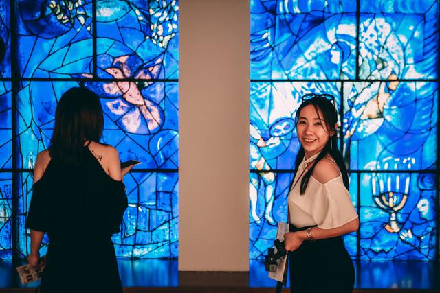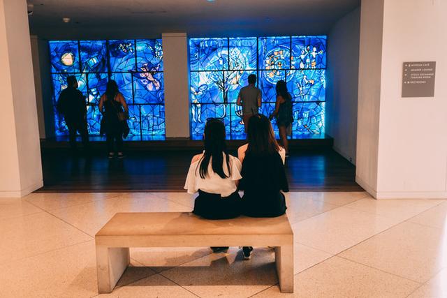 旅美俄裔画家夏加尔的彩色玻璃,一共四扇,以激情的笔触和幻梦般的视觉表现力歌颂了夏加尔心目中的美国,坐在它面前仔细端详,能看到对美国历史、芝加哥天际线、文化艺术成就的狂草式的描绘,一大片动人心魄的蓝色让人沉醉。