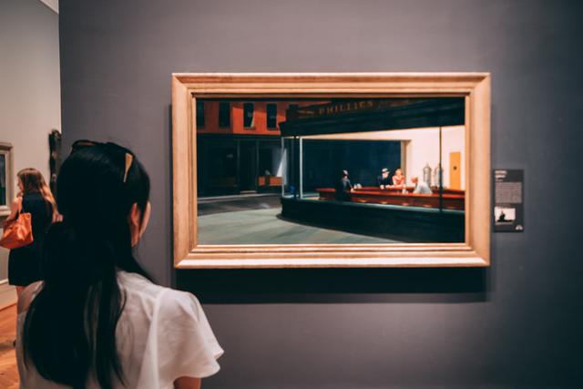必看的馆藏珍品:爱德华·霍普的《夜鹰》。描绘都市夜行人的孤寂,无人能出其右。