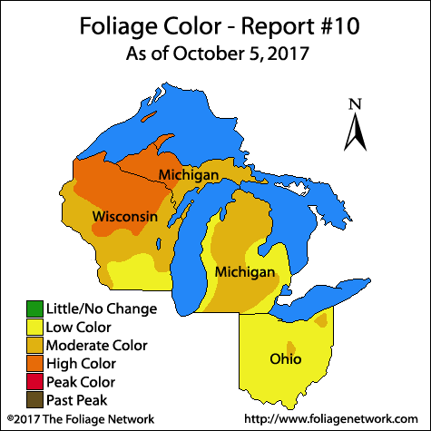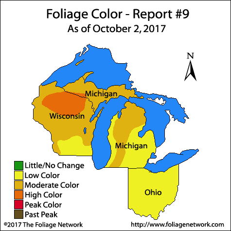 「Fall colors are really picking up now in northern Wisconsin and the western Upper Peninsula in Michigan. These locations are reporting high color (61% - 80% change)……」