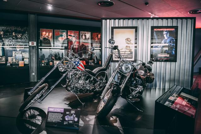 这个展厅的主题是哈雷对美国当代文化的影响,展品有包括《魔鬼终结者》在内多部电影中出现过的哈雷车款,众多电影明星曾经使用过的机车夹克等物品,还有不同年代的哈雷海报,复古的色彩勾勒出哈雷摩托车作为一个视觉符号的冲击力。
