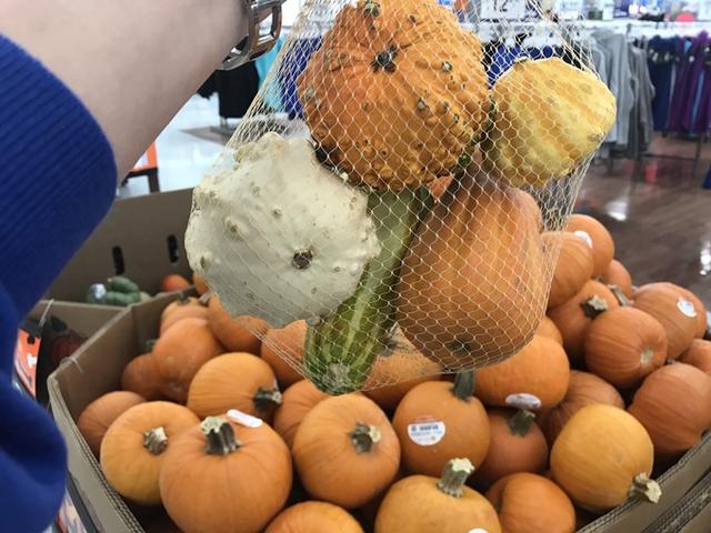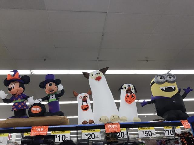 镇上的沃尔玛是饭后散步好去处,到处洋溢着万圣节前夕的气氛,各种型号和种类的南瓜、蠢萌的充气小人颇为有趣。