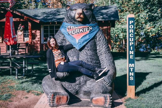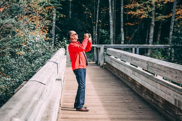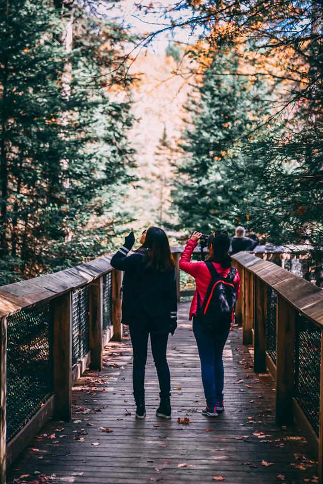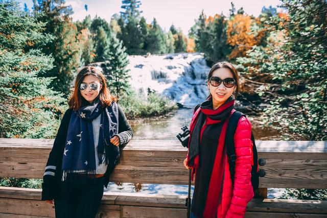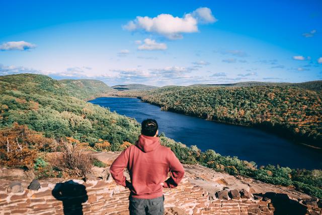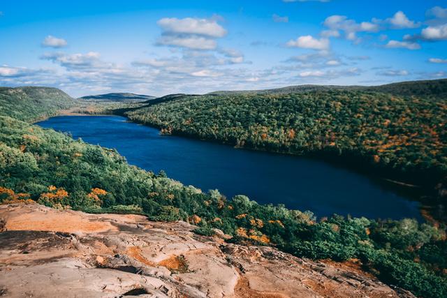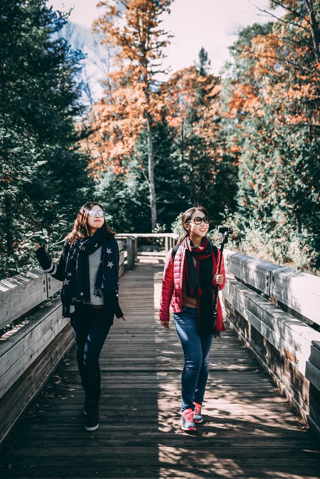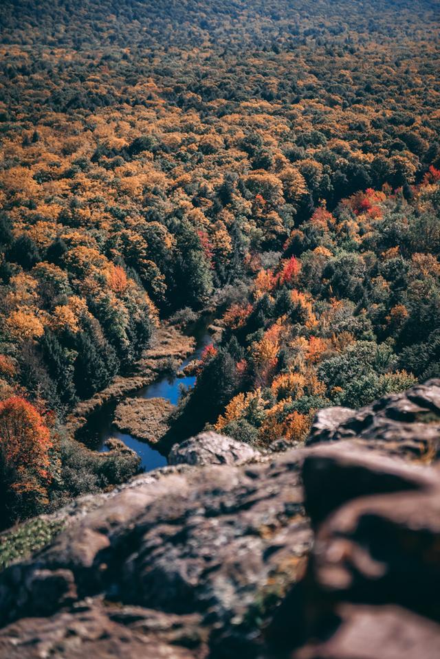 豪猪山森林公园的名片—云之湖(Lake of the Clouds)。红叶季到达巅峰时,这个静谧的高山湖泊像是安睡在华丽的锦缎中,景色十分梦幻。然而当我们亲眼看到它的真容时,内心的感受却有些复杂:也许是苏必利尔湖带来的暖湿气流推迟了叶子变色,大片绿色中错杂着星星点点的红叶,这天的云之湖显然并未呈现最完美的面貌,或许再晚来一个星期,景色将大不同。