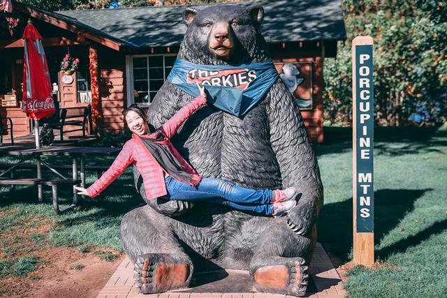 和蠢萌的吉祥物大熊合影,不要问我为啥豪猪山没有造一只蠢萌的迎客豪猪,我也不知道。