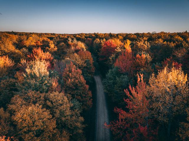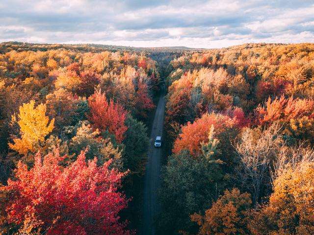 一场秋雨一层凉,仅仅又过了一夜,沿着同路返程时,我们发现红叶的面积和色泽更加理想了,已经接近Peak的状态。由于对昨天傍晚误入的那条小路实在念念不忘,我们再次回到那个湖旁的小路口,转弯进入。这一次,我们索性决定脱离主路,沿小路穿过这片森林(Baraga国家森林公园的一部分)。