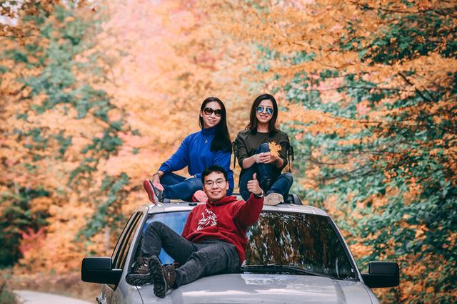 正所谓惊喜永远在路上,北上霍顿的路途中,我们竟然发现路边的红叶渐入佳境,在密度和色彩上都远超云之湖,甚至超过邦德瀑布周边,各种叫得出、叫不出名字的树木都不仅是羞羞答答地红了树冠,而是大方地穿上了一身深红或灿金色。大家的心情再度雀跃起来。