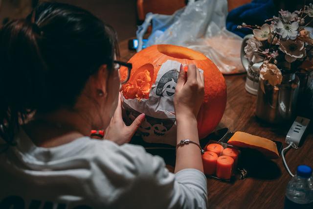 说干就干。从沃尔玛收获三美元一颗的大南瓜和雕刻图样、工具、蜡烛,我们就在客厅里开始了倒腾,分工实施各步骤,再由手工达人我统一做微调和修饰,最终效果拔群!