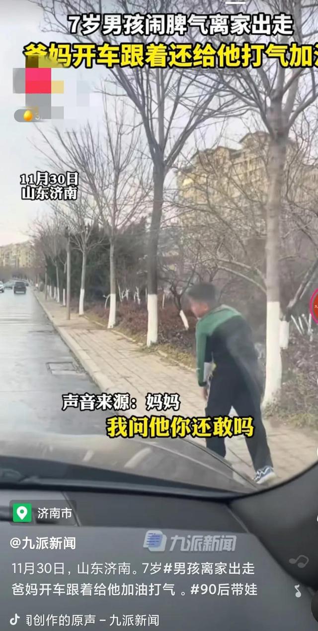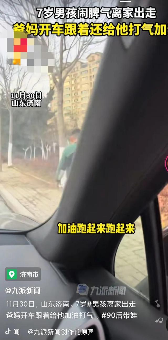 事情原委是这样的:孩子闹脾气,一气之下要离家出走,爸爸和妈妈,开着车跟着,一边跟一边还给孩子加油打气。
