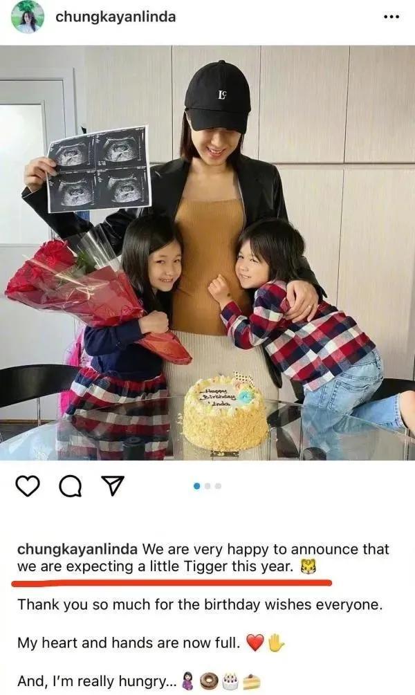 4月10日,钟嘉欣在社交平台上发文,晒出了自己怀三胎的消息,2022年将迎来一个“虎宝宝”。值得注意的是,4月10日也是钟嘉欣的生日。