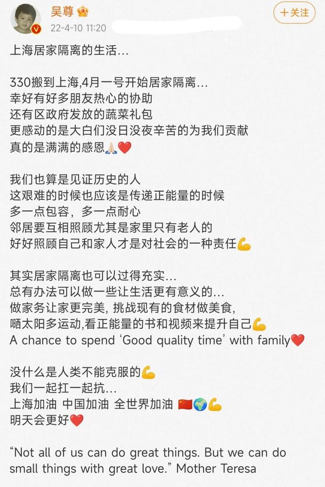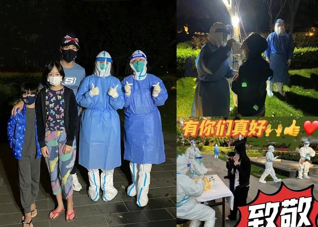 ?在居家隔离的这段时间里,吴尊带着两个孩子一起做核酸,并且与医护人员、大白们一起合影留念,丝毫没有明星的架子。