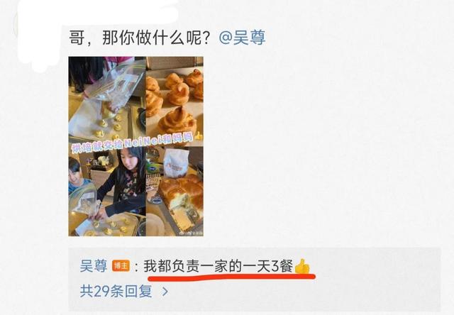 评论区里,吴尊也积极与网友们互动,说自己会负责一家人的一日三餐,“居家好男人”形象立马就立住了。