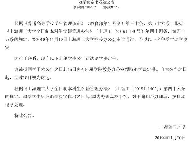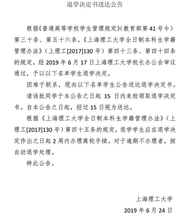 2019年6月4日,上海理工教务处发布《拟退学通知书送达公告》,共计有14位学生在名单上,其中2位为英文名字。2019年6月24日,上海理工正式下达《退学决定书送达公告》,共计有12人在退学学生名单上。