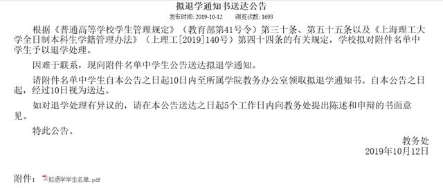 2019年10月12日,上海理工教务处再次发布《拟退学通知书送达公告》,公告称“学校拟对附件名单中学生予以退学处理。因难于联系,现向附件名单中学生公告送达拟退学通知。”经统计,附件中共有98位同学。
