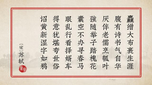《和董传留别》这首诗是苏轼罢官后赴汴京,途经长安时,与朋友董传临别留赠。苏轼在凤翔府任职时,董传与苏轼相从,当时董传生活贫困,衣衫朴素,但饱读诗书,满腹经纶,平凡的衣着掩盖不住他乐观向上的风骨。苏轼以诗称许董传的志向,同时也祝愿他黄榜得中。其中“腹有诗书气自华”,想必不常读书的芸芸一众,也会略有所闻。
