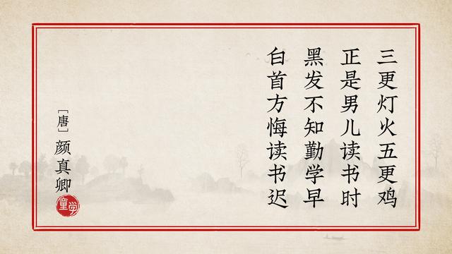 颜真卿三岁丧父,家道中落,其母对他寄予厚望,以严格家教,亲自督学。颜真卿也格外勤奋好学,每日苦读。终成书法大家。这首诗正是颜真卿为勉励后人所作,希望世人重视后天学习,加强自身修为。