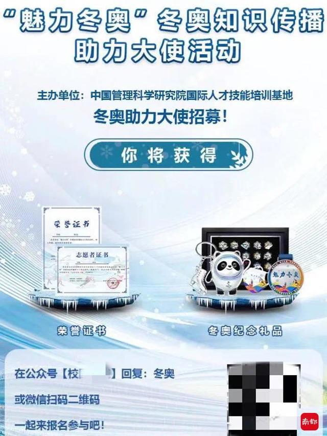 今年2月,北京的李女士(化名)在一个家长交流群看到一张“‘魅力冬奥’冬奥知识传播助力大使活动”的海报。发布者称“给孩子领个冬奥大使证书……小学生、中学生、生均可参加”,还称“可以作为孩子的社会实践”。