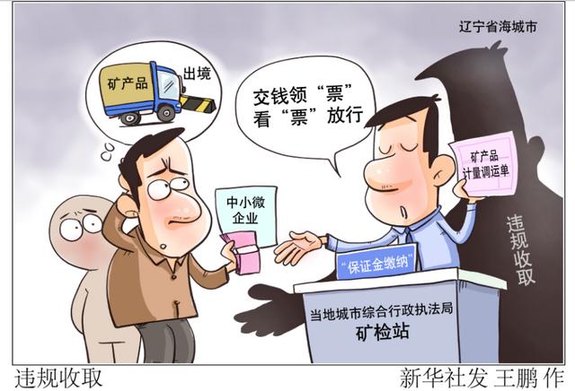 近年来,国家有关部门重点清理规范涉企金。第六督查组赴辽宁省海城市明察暗访发现,当地城市综合行政执法局设立20多处矿检站,对所有矿产品生产经营企业收金。金从几百元到几万元不等,交钱领“票”,看“票”放行,仅1月至8月就收取金1.46亿元,涉及市场主体1500多家。