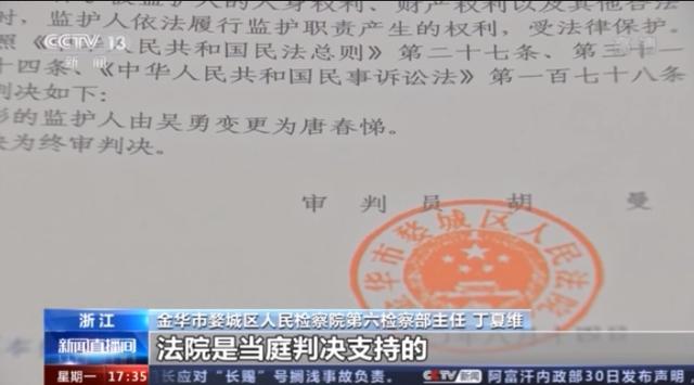 浙江省金华市婺城区人民检察院第六检察部主任 丁夏维:我们从她的行为上已经看到,她自己非常愿意觉得来接过这一棒,把妹妹的孩子看好。我们通过支持起诉来落实她的监护权的变更,申请法院把小兰的监护权从她的父亲这里转移到她的大姨。法院是当庭判决支持的。