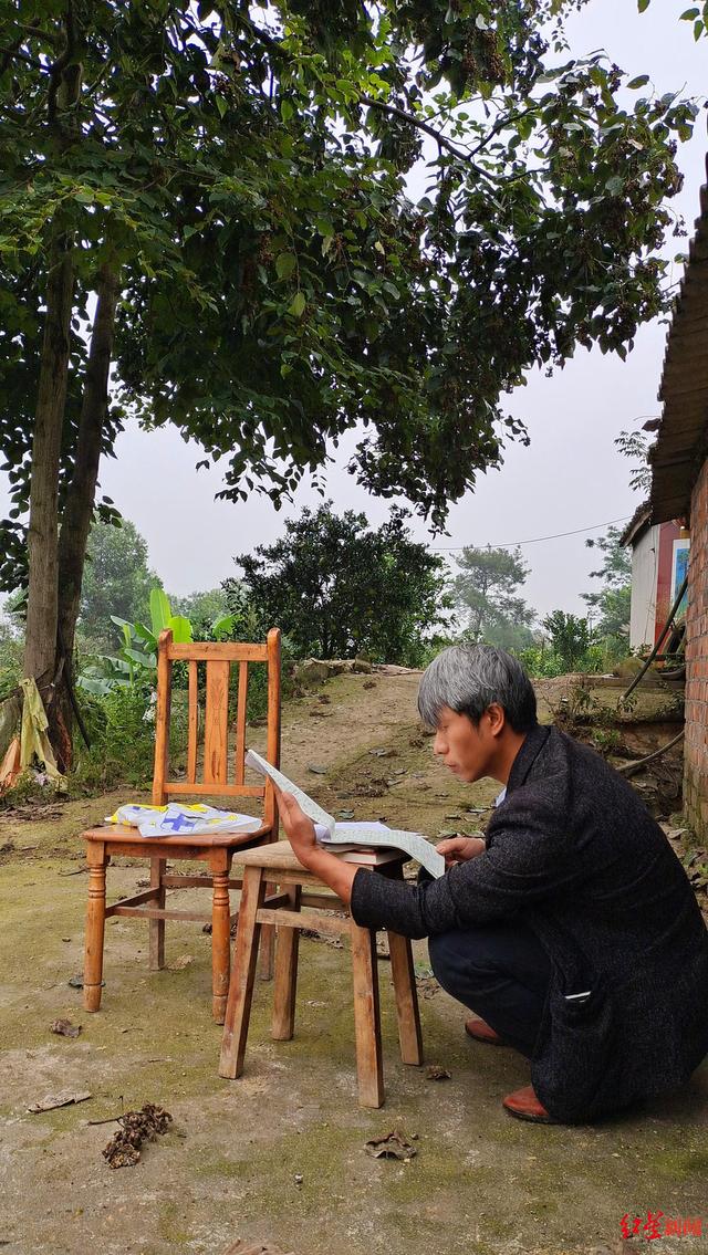 宏宏父亲谢颖在老家树下翻看宏宏物品