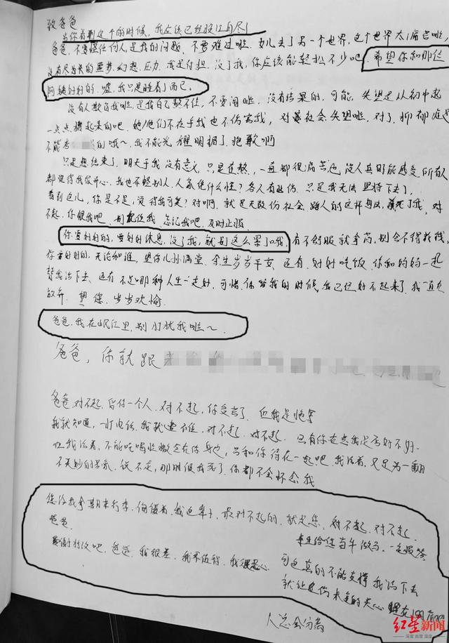 不过,在宏宏给外公外婆、父母、妹妹写下的五封遗书里,除了写道“已经投江自尽、在岷江里、睡在江底、长眠于岷江”,宏宏还多次写下这样的字眼:“好累”“失望”“熬不住了”“无法坚持”,“没有我就没有这么累,失望是从初中起一点点站起来的……不能光耀门楣了,抱歉啊……”