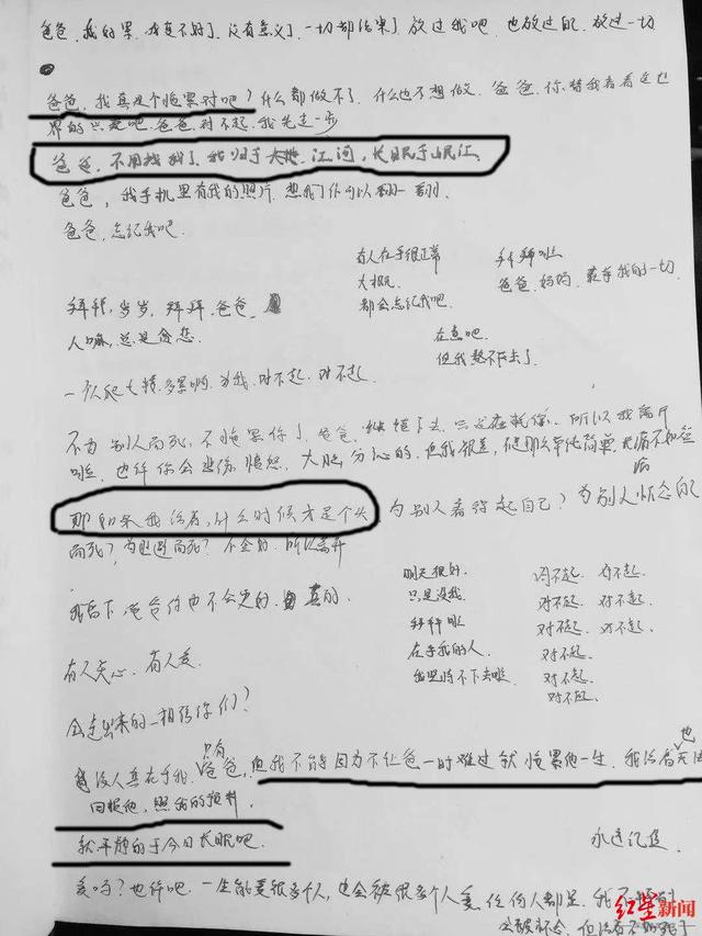 而在写给爸爸的遗书中,她写道:“爸爸,我真是个拖累对吧,什么都做不了,什么也不想做,爸爸你替我看着这世界的光亮吧,爸爸对不起,我先走一步了,爸爸不用找我了,我归于江河长眠于岷江。”