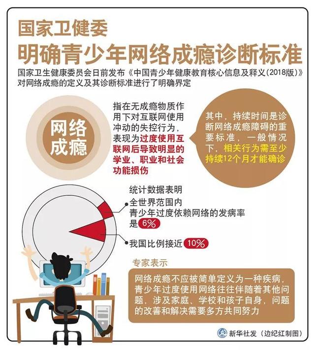 根据《中国青少年健康教育核心信息及释义(2018版)》,网络成瘾指在无成瘾物质作用下对互联网使用冲动的失控行为,表现为过度使用互联网后导致明显的学业、职业和社会功能损伤。其中,持续时间是诊断网络成瘾障碍的重要标准,一般情况下,相关行为需至少持续12个月才能确诊。
